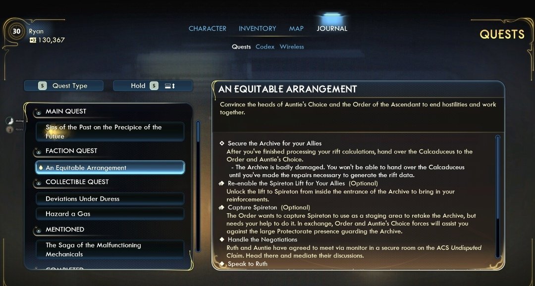 Hi, I've played through The Archive, repaired the AI, cleared the whole area, reclaimed Spireton, and processed the Rift Data. Right after processing the Rift Data I get this objective to "Hand Over the Calcaduceus" right outside the AI's Room. But there is no NPC there. I'm confident I've done every single objective leading up to Processing The Rift Data: 1. I checked my quest journal and apparently I still need to repair The Archive despite already doing so. (Cleared Underlands, Punching Cards, and Reactor) 2. Reclaimed Spireton through stealth without the Order's help. But this was after I've cleared the Archive of protectorates. The leader NPC in Spireton doesnt trigger any conversation to get them going into the Archive. 3. I can still proceed with the Main Quest. Got the conversation trigger from VAL about Horizon Point reappearing. 4. However I am proceed to get Auntie's Choice and The Order to ally with me for this final quest due to being unable to proceed past ""Hand Over the Calcaduceus" objective (I opted and succeded in forming the alliance prior to this. I've helped Auntie get a body too) Supporting screenshots attached.