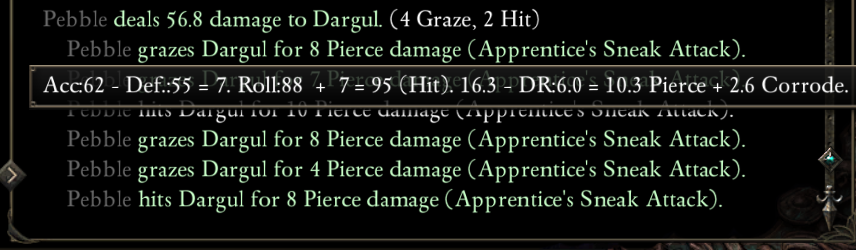 My player character is a Cipher and I've generally been initiating combat (as in before turn-based mode begins) with an attack from stealth by her with Lead Spitter for the focus gain. However, I've noticed this opening shot consistently deals substantially less damage (even with Apprentice's Sneak Attack!) than subsequent attacks made with Lead Spitter on the same enemies. After reviewing the combat log, I saw that the damage calculation was not showing any DR subtracted from Lead Spitter's DR bypass on this initial attack (see image). I also tested turning Turn-Based Mode off in the current beta patch, and this caused DR bypass to be correctly applied on this opening attack again, so this is specifically a TBM issue.