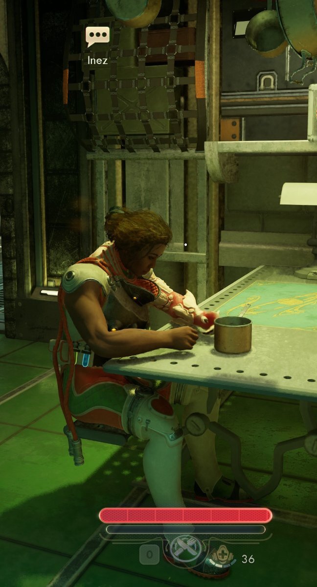 I've had this speech bubble above Inez's head for as long as I can remember. I've exhausted all her dialog, and there's nothing else to talk about, but it's still there. I restarted the game, I went to older saves, talked and talked and talked with her, I sent her back to the ship, pretty much everything I can think of, but nothing will fix this.