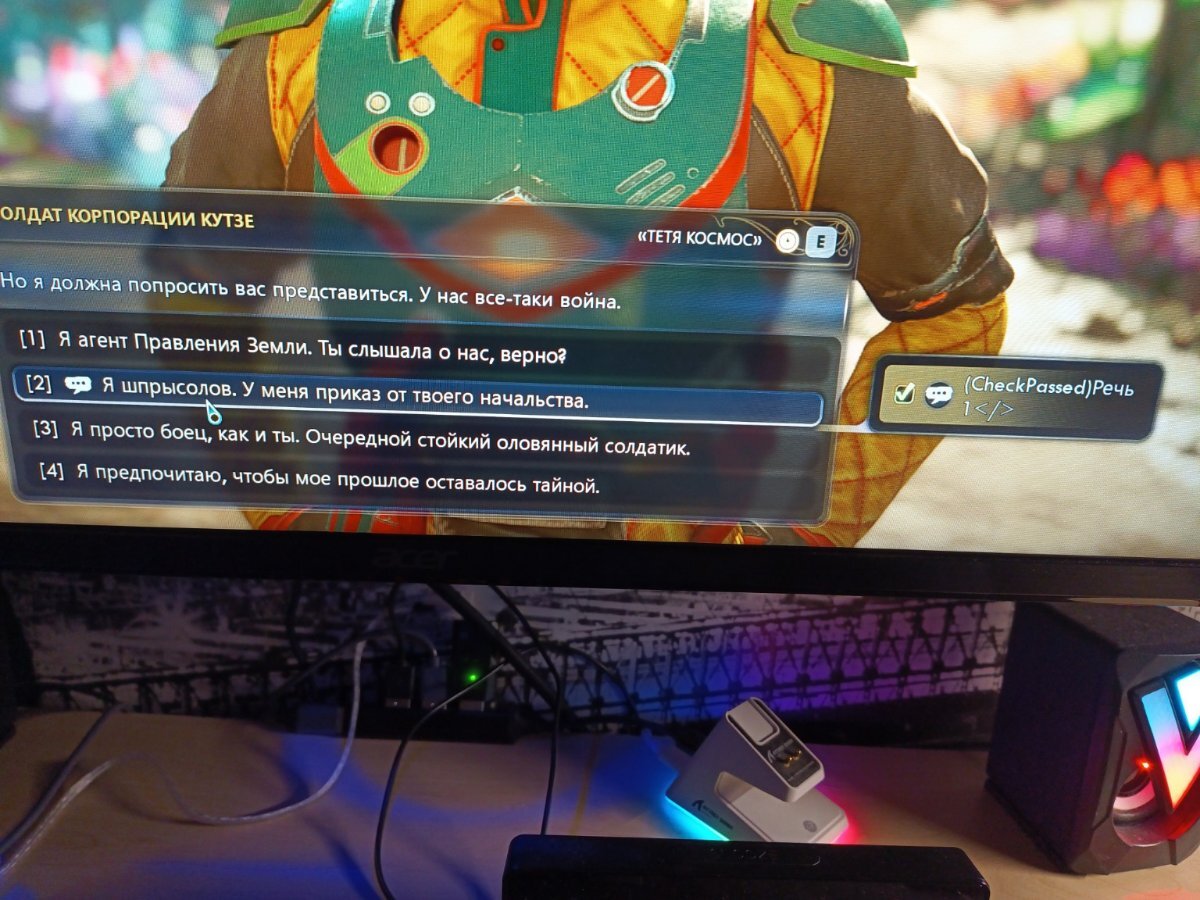 1. Hello! game version 1.0.4.2 patch I’ve encountered an issue with the Russian localization in The Outer Worlds 2. Some UI elements and dialogue skill checks display broken or untranslated text instead of proper Russian strings. This happens in several places, including: Dialogue skill checks (Speech, Intimidate, Lie, Science, etc.) Interactions with terminals and locks Various in-game prompts and tooltips On the English version everything works correctly — so it seems that some localization keys are missing or corrupted in the Russian .locres files. Below is an example of the issue — please see the screenshot. Could you please forward this to the localization team or confirm if an updated Russian language pack is planned in an upcoming patch?