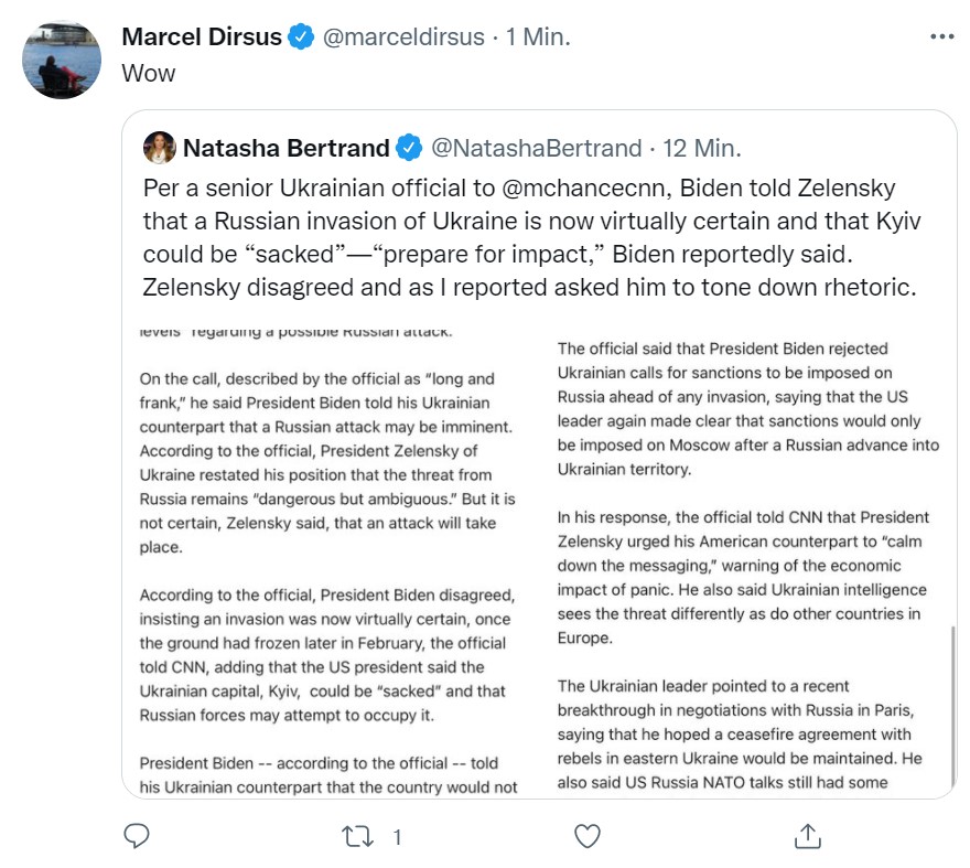 Malcador Posted January 28, 2022 Posted January 28, 2022 1 hour ago, Zoraptor said: Multiple sources are carrying various interpretations of that Biden/ Zelensky exchange. The most baffling part of it by far is 'once the ground is frozen'. It's already frozen and has been for weeks, and in contrast every day gets closer to the Rasputitsa. Could be a Bidenism of "while the ground is frozen" but even that doesn't make much sense in context. For the more full version, [with apologies for the shonky embed, I think twitter hates me for having high privacy settings and the original tweet got got...] https://pbs.twimg.com/media/FKJDVv9XsAoYd-c?format=jpg&name=900x900 If it's an accurate representation- and there are multiple, similar takes from other sources- it's pretty damning. Pretty funny the Ukrainians are trying to tamp down rhetoric. Well the government at least, on social media it's all holy war against Russia. Why has elegance found so little following? Elegance has the disadvantage that hard work is needed to achieve it and a good education to appreciate it. - Edsger Wybe Dijkstra
